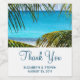 Um obrigado de casamento que você marca com uma bela fotografia de uma praia tropical turquesa com grandes frondes de palma verdes armando a cena.