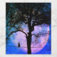 Lua de cheio fantástica de matizes roxos e céus azuis cobaltos com um gato preto a olhar para ele