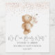 Rótulos de vinho e bebida para chá de bebê com a frase 'MAL PODEMOS ESPERAR o bebê chegar!', confeitos em dourado rosado, ilustração de um urso boêmio em aquarela segurando grama-dos-pampas, flores delicadas em pêssego, olhando para um besouro. Os estilos, tamanho e cor da fonte podem ser alterados clicando no link personalizar ainda mais após a personalização.