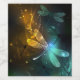 Voo de libélula brilhante, verde, desenhada artisticamente, com asas verdes e amarelas transparentes sobre fundo noturno brilhante com plantas pântanas e vagalumes. Dragonfly brilhante.