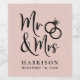Dê uma torrada de casamento e talvez seus convidados de casamento tenham uma lembrança divertida mantendo seu dia especial com vinho rotulado com essas etiquetas de garrafa de vinho cor-de-rosa com "Sr. & Sra." escritas em um grande roteiro e uma ilustração de dois anéis de casamento reunidos. Adicione seu nome e data do casamento.