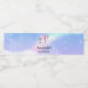 Etiquetas de água de eventos com uma imagem de um unicórnio com grandes olhos azuis, asas cor-de-rosa e um arco-íris e cauda. Kawaii fofo.