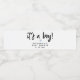 Etiqueta de garrafa de água simples e elegante para a sua festa de chá de fraldas. O texto diz "é um menino!" numa letra moderna. Você pode adicionar o nome da futura mãe e a data do evento. Há um coração azul bonito no meio. Design para os minimalistas!