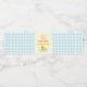 Um pato sortudo! Primeiro aniversário com pato de borracha e bolhas contra gingham azul claro e fundo amarelo pálido com texto laranja