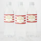 Etiquetas de garrafas de água de Natal felizes com padrões de listras vermelhas e brancas, detalhes de ouro e nome personalizado.