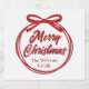 Chic, moderna escrita cursiva através de uma bela fita vermelha e arco lê MERRY CHRISTMAS em elegante tipografia cursiva. Um arco amarrado é uma super tendência para as etiquetas de garrafas de champanhe de festas de férias de 2025. Personalize com seu nome de família ou de empresa no centro.