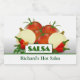 Ilustração gráfica do artista/designer Charmaine Paukson dos tomates, cebolas, pimentos quentes e cilantro numa etiqueta de conservas. O rótulo tem um modelo de texto para sua personalização.