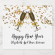 Vinhos espumantes com rótulos de vinho espumante para a véspera de Ano Novo. Personalize com seu nome. Brincando copos de vinho espumante e confete de ouro em branco.