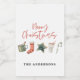 Uma design festiva divertida com a aquarela favoritos de inverno - chocolate quente, cana doce, estocagem. Feliz Natal em letra contemporânea, perfeito para celebrar o feriado. pode ser editado, parte de uma coleção.