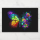 Arco-íris, borboleta monarca luminosa, pintada artisticamente com buquê de rosas iridescentes, brilhantes e luminescentes sobre fundo preto. Borboleta-arco-íris.