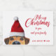 Uma bela ilustração do animal de Natal: Curioso cão vestindo um chapéu de Papai Noel. Cartões de natal sazonal escrito em letras tipográficas modernas.