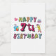 Feliz aniversário de 7. Design de aniversário engraçado e fofo com um lindo ursinho de pelúcia segurando um presente e um lápis engraçado escrevendo os desejos de aniversário. Uma combinação perfeita para roupas, camisas e acessórios.