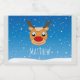 Um design festivo e animador com uma rena sorridente em meio a uma queda suave de neve contra um fundo azul tranquilo, personalizado com um nome personalizado para um toque de mágica de férias. Perfeito por adicionar um toque de alegria sazonal.