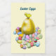 A galinha pequena está pronta com os ovos de Páscoa para caçar ovos.