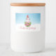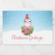 Etiquetas de comida com um design agudo e branco com um pinguim adorável vestindo um chapéu de santa vermelho. Ficando atrás de um buquê de flores com canas doces listradas cor-de-rosa e branca. Um fundo de inverno nevado com flocos de neve caindo.