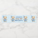 Beary first boys festa de aniversário tableware personalizado etiquetas de garrafa d'água, um ursinho de pelúcia agudo de cor d'água vestido de calça e uma gravata de arco segurando um balão azul etiquetas d'água azul marrom e branco.