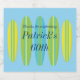 etiqueta azul brilhante, verde e amarela de aniversário de surfboard.