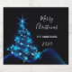 Uma moda de cerveja de festas de Natal moderna e moderna em preto, azul e branco. Um fundo preto com uma brilhante árvore de Natal azul brilhante decorada com estrelas. Com o texto: Feliz Natal escrito com um roteiro de estilo moderno e moderno, com grandes letras brancas. Modelos para seu nome de família e um ano.