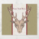 Este rótulo de garrafa de cerveja personalizado tem uma cabeça de cervo marrom com um rosto esticado preto e contornos vermelhos e grandes galhadas em um fundo branco, vermelho profundo e listrado bronzeado. Personalize seu texto com o modelo.