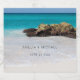 Etiquetas de garrafas de casamento com uma bela fotografia. Uma praia branca arenosa, com um surf gentil. A água turquesa tropical rodeia uma rocha agitada.