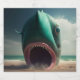 Escultura de tubarão na praia, ao estilo de ser renderizado no cinema4d, ilustração grotesca e surrealista, ciano escuro e verde, arte conceitual, escala gigantesca, lentes de olho-de-peixe