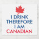 Eu bebo, portanto sou canadense com uma folha de bordo canadense. Uma paródia / paródia da citação popular original / dizendo por René Descartes "Eu Penso, Portanto Sou". Texto/fonte em azul e vermelho com fundo branco. Humor estereótipo canadense.