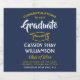 Adicione um toque personalizado à faculdade ou decorações de festa de formatura de segundo grau com estas elegantes etiquetas de garrafas de cerveja azul, branca e amarela de marinho. Design apresenta a tipografia moderna na moda, a caligrafia de script de estilo manuscrito e uma mensagem personalizável lendo "Parabéns para nosso Formando". O texto na parte inferior inclui ano de aula, nome de escola e linhas opcionais para grau, tipo de bebida ou outras informações. Todo texto é simples de personalizar. Observe que o ouro é impresso a cor, não a folha metálica. Essas etiquetas fazem uma ideia de na moda festa de formatura e uma elegante adição à celebração do dia especial do formando. Felicidades!