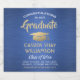 Adicione um toque personalizado à faculdade ou decorações de festas de formatura de segundo grau com estas elegantes etiquetas de garrafas de azul, de ouro e de cerveja branca. Design apresenta um fundo de aço inoxidável esfregado, tipografia moderna na moda, caligrafia de scripts manuscritos e uma mensagem personalizável lendo "Parabéns para nosso Formando". O texto na parte inferior inclui ano de aula, nome de escola e linhas opcionais para grau, tipo de bebida ou outras informações. Todo texto é simples de personalizar. Observe que o ouro é impresso a cor, não a folha metálica. Essas etiquetas fazem uma ideia de na moda festa de formatura e uma elegante adição à celebração do dia especial do formando. Felicidades!