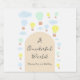 Um mundo maravilhoso! Primeiro aniversário com balões de ar quente verde, amarelo e azul claro ao lado de nuvens de aquarela.