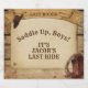 Levante um pouco de poeira com este rótulo de garrafa de cerveja de despedida de solteiro "Groom's Last Rodeo". Com um fundo de madeira rústica, um centro de pergaminho vintage marrom claro, um chapéu de cowboy no topo e botas na parte inferior, este design define o tom perfeito para uma despedida selvagem no oeste. Personalize o texto para dizer "Saddle Up Boys, It’s [Name]’s Last Ride" - perfeito para personalizar com o nome do noivo, data e detalhes da festa. Ótimo para festas de despedida de solteiro com tema country, rodeio ou faroeste.