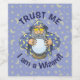 Um velho feiticeiro com capa azul olhando para a bola mágica de cristal.