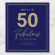 Simples sinal de festa de aniversário azul e dourado "50 e Fabuloso" com tipografia elegante e elegante. Personalize-o facilmente com a idade, o nome, a data e o local da festa. Perfeito para presente de aniversário ou favor de festa.