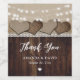 Etiquetas de garrafa de vinho de campo russo com corações de burlap em madeira rústica, burlap e fundo de renda adornados com luzes de cordas.