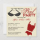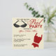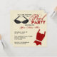 Um convite inspirado retro da festa na piscina que caracteriza uma ilustração de um par de óculos de sol pretos no superior esquerdo e em uma obscuridade - direito de duas partes retro vermelho do fato de banho no fundo. Personalize o texto vermelho e preto com detalhes de sua ocasião.