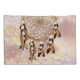 Um design de apanhador de sonhos com acabamentos em dourado e marrom que inclui um círculo de bambu redondo com teia da vida com penas em tons marrons e contas vermelhas sobre um fundo de penas macias.