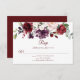 Lindos buquês de peônias, rosas, flores silvestres e folhagens combinando RSVP. A parte de trás do cartão é um vermelho escuro. Há um convite correspondente disponível.