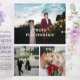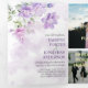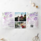 O convite trifold apresenta um design floral suave em estilo aquarela. Grupos de flores delicadas em tons de roxo, lavanda e rosa florescem na parte superior e inferior, entrelaçados com folhas verde-claro e galhos sutis. O layout cria uma moldura natural suave ao redor do centro, chamando a atenção para dentro, mantendo uma estética leve e elegante em todo o convite. A paleta de cores parece romântica e fresca - perfeita para uma celebração de primavera ou verão.