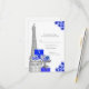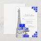 Cartão de resposta Paris RVSP com bela Torre Eiffel prateada, elegantes pacotes de presentes de Paris, sapatos de salto alto prateados em um fundo floral azul royal. Este lindo cartão RSVP de Paris é facilmente personalizado para o seu evento, basta adicionar seus detalhes no estilo de letra e cor, e texto de sua escolha. Você também pode alterar a cor do fundo. Este é um design impresso sem diamantes reais, jóias, brilho, etc.