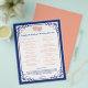 Este itinerário de casamento real, azul, pêssego e branco é uma adição perfeita a uma cesta de boas-vindas ao casamento de destino. Seus hóspedes certamente ficarão impressionados com este guia prático para que eles saibam o que está guardado para eles durante os dias em volta do seu casamento. O design apresenta um esquema real de cor azul, pêssego e branco com o texto impresso em azul real e pêssego. Há uma decoração de quadros de rolagem azul real que corresponde ao convite de casamento e há um par de corações unidos no topo em simulações de brilho de pêssego cercadas em cristais. A parte de trás pode conter mais informações se você precisar. Entre em contato com niteowlstudio@gmail.com se precisar de alterações ou outros itens correspondentes.