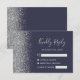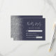 A borda esquerda desta elegante placa de caixa RSVP de casamento moderna apresenta uma borda cintilante de falso prateado. O texto personalizável combina a escrita manual de cinzas prateadas, fontes copperplate e itálico em um fundo azul escuro de marinho. O verso apresenta um design azul escuro e prateado correspondentes.