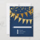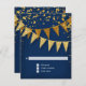 Placa de retorno de resposta RSVP com envelope. Sonolento. Moderno. Chic. Glam subestimado - com faixas de pennant brilhantes em dois tons de brilho de ouro com cintilação cintilante caindo confetti em vários tamanhos e sombra de ouro. As estrelas brilhantes de estrelas de estouro cintilantes destacam a faísca. Um layout de texto de tipografia muito contemporâneo que é tudo menos tradicional. É simples e breve. Diz aos seus convidados, "Vamos dar uma festa e será a festa da vida!" Para a noiva e noiva elegante, mas não tradicional. CORES: azul-cobalto de safira real e marinho escuro profundo, e ouro, brilhos de ouro. Especialmente adequado para o outono ou casamentos no inverno, Festas de Véspera de Ano Novo, Festas de aniversário e anúncios da festa de Aniversário.