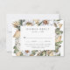 Cartões RSVP elegantes, únicos para refeições de casamento florais, com data de RSVP, o personalizado aceita/declina o texto e janta opções moldadas por flores brancas de aquarela e folhagem exuberante em tons ricos de verde, bege e terra marrom. O cartão de resposta do casamento floral reverte para um fundo de aquarela bege claro. Projetado para coordenar com nossa coleção de casamento Boho White Floral & Greenery.