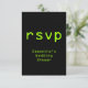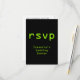 Este design de cartão de R.S.V.P. com tema de computação e estilo digital apresenta a mensagem "rsvp" na frente, juntamente com o nome personalizado do evento. Também apresenta um formulário de RSVP personalizado no verso para o destinatário preencher. Cartões de RSVP como este podem ser usados para descobrir quem estará presente em um chá de noiva, uma festa de formatura, uma festa de aposentadoria, uma recepção de casamento ou algum outro evento.