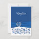 Este romântico cartão azul-real e branco de recepção de casamento floral tem uma imagem de um coração azul-real e prateado sobre uma imagem de fita azul real que atravessa a parte inferior do cartão sobre flores azuis reais em um fundo branco com a palavra Recepção em roteiro branco sobre a fita. A parte de trás tem um fundo azul e branco real com os detalhes da recepção ou outras informações impressas em azul real com um ornamentado de rolagem em volta do texto. Se você precisar de outros itens correspondentes, envie seu pedido por e-mail para niteowlstudio@gmail.com ou use o recurso de bate-papo Zazzle para entrar em contato.