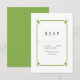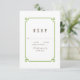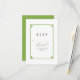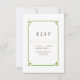 Cartão de RSVP de casamento Deco Chic simples e minimalista com uma moderna moldura ornamental art déco verde. Este cartão de resposta clássico e elegante é fácil de personalizar com os detalhes do seu casamento. Encontre mais opções de personalização clicando em Personalizar.
