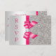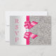 Cartões planos RSVP de casamento personalizados / convites. Elegante cor prateada e rosa-quente personalizada com placas de resposta duplas de lado com um lindo padrão de sequências brilhantes impressas, arcos e fitas vetoras impressas, cor-de-rosa-giro e brilhante, e diamantes bonito e impressos em na moda, bling jewels and hot rosa rosa. Estes rsvps elegantes e elegantes, cor-de-rosa e prata, são decorados em ambos os lados. Belo, chique, moda, moderno, cartões duplos de lado feminino com brilho e glamour. Por favor, note: todos os convites para o Zazzle têm imagens impressas em formato plano. Eu tenho produtos correspondentes para casamentos na minha loja. O texto, a fonte e as cores da fonte são todos personalizáveis/personalizáveis para atender às suas necessidades. Se precisar de ajuda para personalizar seu produto, entre em contato comigo através da minha loja. Ficarei feliz em ajudar.POR FAVOR, OBSERVE:- Todos os convites no Zazzle têm imagens impressas em formato plano.