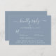 Cartão RSVP de casamento azul empoeirado e empoeirado apresentando "rsvp" em um roteiro branco na moda com baloiços, tipografia branca simples e moderna, opções personalizadas de entrada de menu e seus nomes unidos por um coração no verso.