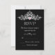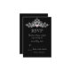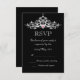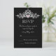Design de cartão RSVP de casamento elegante com um candelabro prateado muito detalhado em um fundo preto. Esta design vem em vários produtos de papelaria para fazer um tema bonito para toda a sua papelaria de casamento.