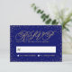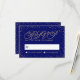 Estrelas de ouro pequenas e brilhantes brilham em nuvens de confete ao redor da borda desta bela placa de resposta azul marinho profunda, com um script de efeito de brilho dourado, "RSVP". Rico, chic e encantador de uma só vez. Perfeito para um casamento noturno debaixo das estrelas. Arte original de Colleen Michele. Por favor, note-se que não existe um verdadeiro efeito de brilho de ouro ou de folha de ouro nas estrelas e no guião; não será utilizada qualquer brilho, folha de ouro ou tinta metálica neste convite.
