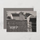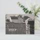 Personalize o charmoso e casual Cartão de Resposta RSVP de Casamento de Fazenda do País com a data de resposta do casamento. Esta placa nupcial rpv.p. do tema de rancho personalizado informal e relaxada apresenta uma fotografia de fazenda de tom de sépia quinta de um celeiro branco e um posto de cerca de cimento com arame farpado.